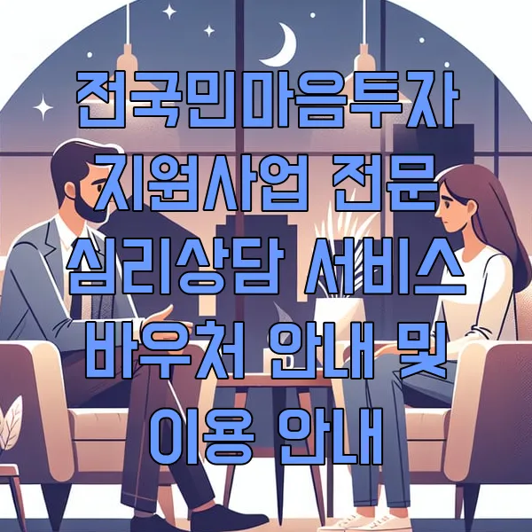 전국민마음투자 지원사업 은 국민의 정신건강 돌봄과 정신질환 예방을 위해 전문 심리상담 서비스 바우처를 제공하는 프로그램입니다. 이 프로그램은 우울, 불안 등의 정서적 어려움을 겪는 국민들을 지원하고자 합니다.